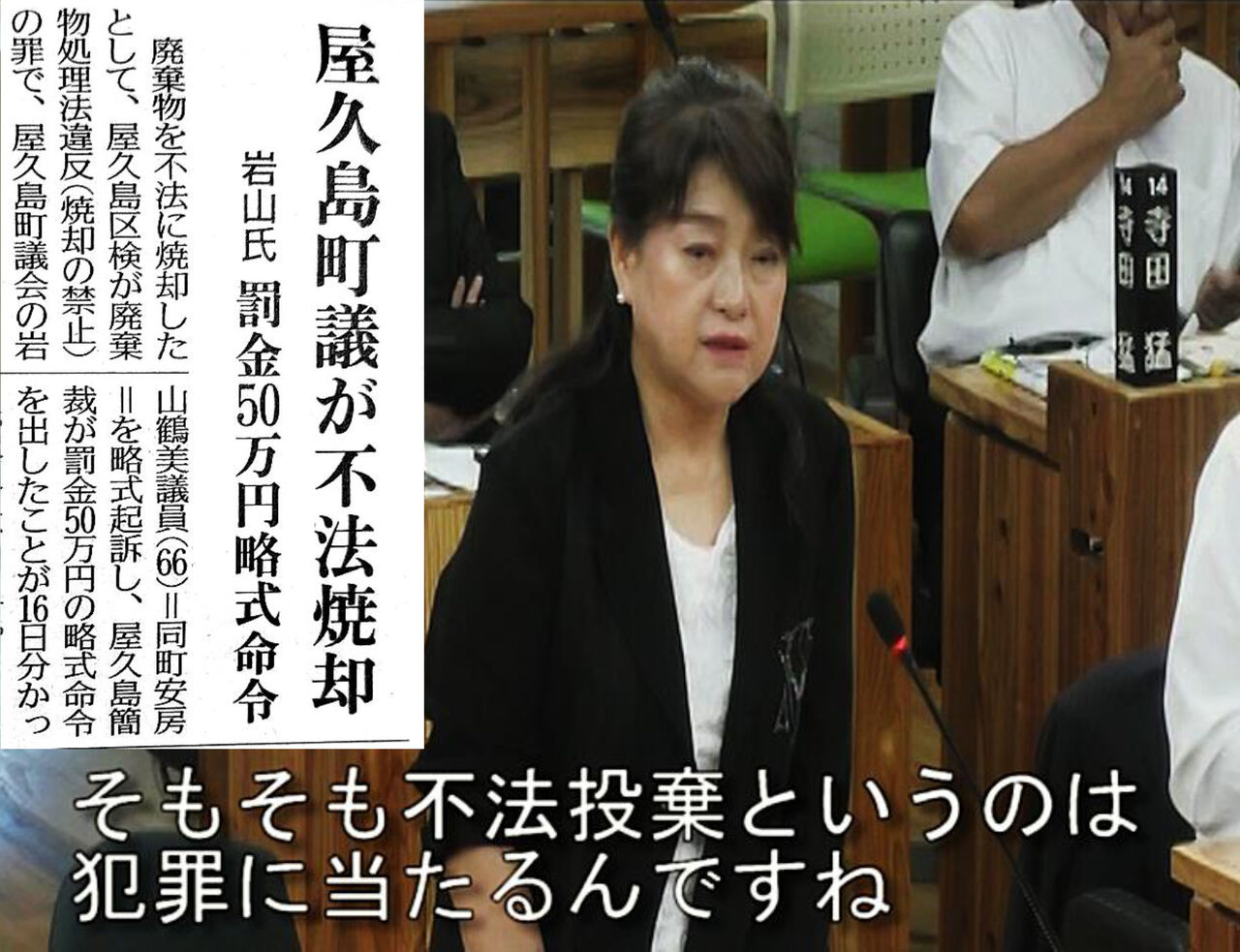 石田尾議長が削除を要求しているのは、屋久島ポストが2022年3月10日に掲載した「【動画】で検証 岩山鶴美町議の議会発言 犯罪性を認識 鹿児島・屋久島町議アパート廃材焼却問題」の記事に付く動画。自身で経営する賃貸アパートの廃材を不法投棄して焼却した岩山町議が、その1年前の2019年9月の町議会一般質問で、ごみのポイ捨てなどに罰金を科す町独自の条例の制定を提案した時の記録だ。町議本人が「不法投棄は犯罪に当たり、決して許されない行為」などと述べる様子が録画されている。