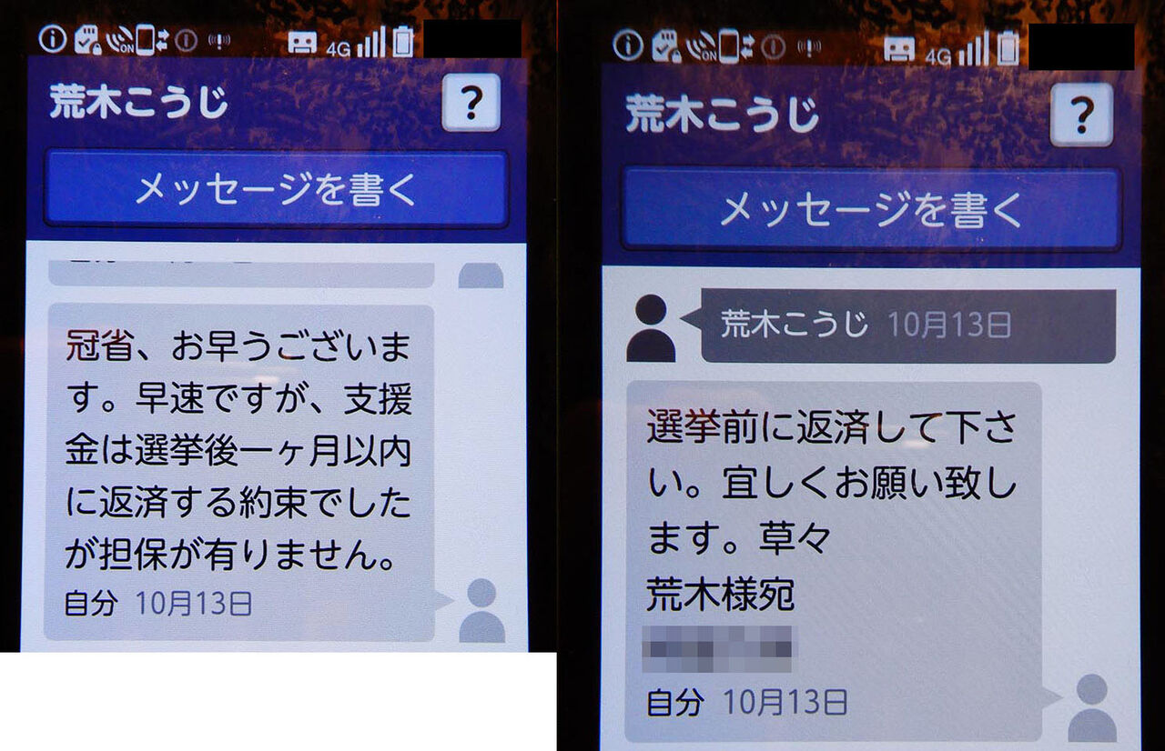 現金返還の求めに対して、町長が送った携帯メール(左)と振り込みを求める業者の携帯メール(2019年10月13日送受信)