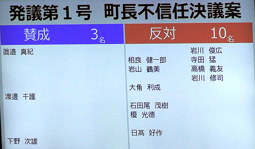 多数決は民主主義の原則なので、この結果は受け入れなければなりません。しかし、提案に反対する討論のなかで、荒木町長の不正を証言した住民に対し、「氏名を公表すべきだ」「議会で証言できるのか」などと述べ、いずれもできないであろうから、その証言には「信憑性がない」と断じる主張があったことには、大きな疑問が残りました。