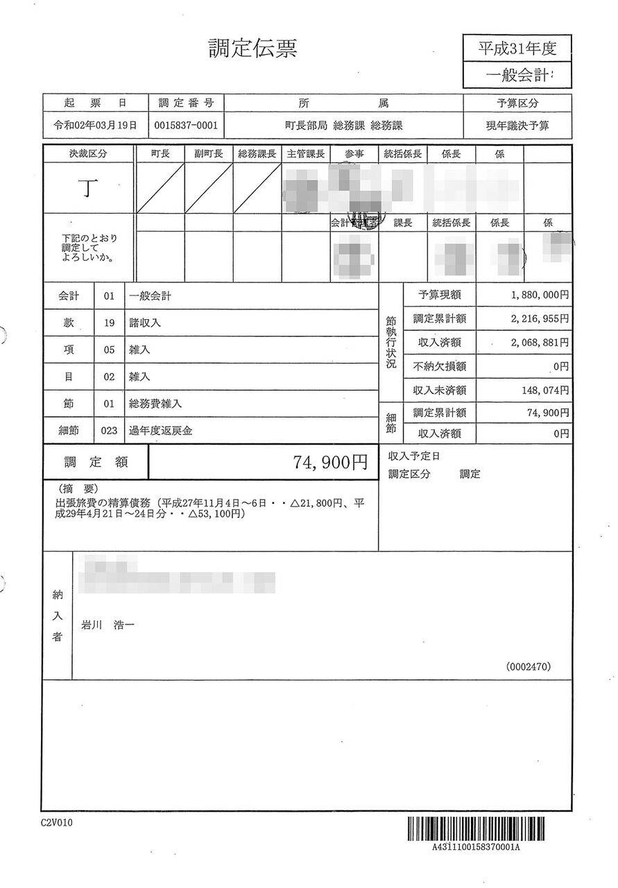 岩川浩一副町長(当時)が町に旅費を返還する際に作成した「調定伝票」。ほかの不正請求も含め、7万4900円を返還する内容だった