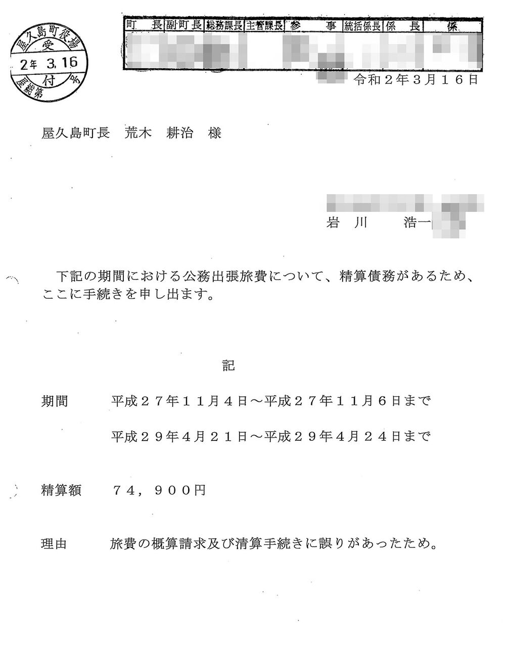 岩川浩一副町長(当時)が町に旅費を返還する際に作成した精算書。旅程を東京経由、航空運賃を2万6110円に修正し、5万3100円を返還する内容だった