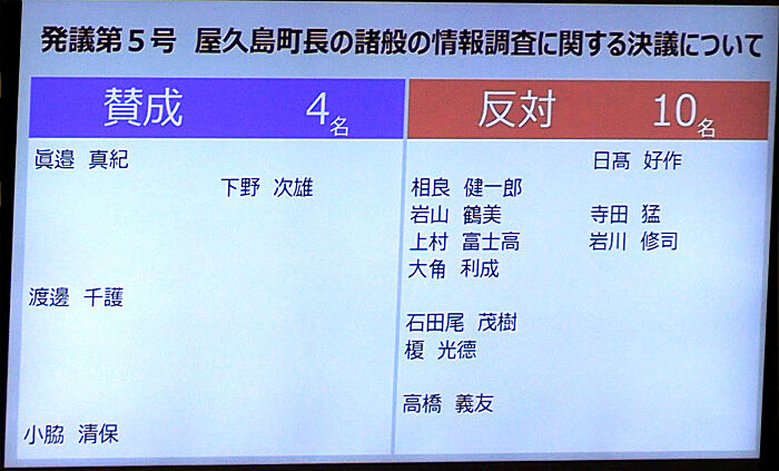 屋久島町の荒木耕治町長に対して、町事業への参入を目指す業者が現金200万円を提供したと主張していることや、荒木町長が航空運賃のシルバー割引を利用して「出張旅費を着服している疑いがある」と指摘されている問題をめぐり、屋久島町議会は1217日、百条委員会(調査特別委員会)の設置を求める決議案を反対多数で否決した。