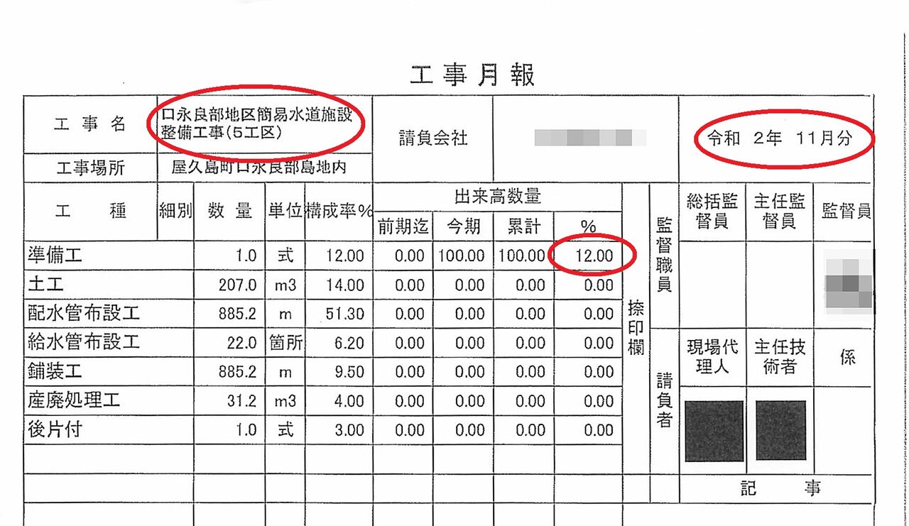 屋久島ポストが入手した月報によると、全工区で工事の出来高を「100%」と報告した業者はなかった。また、月報の提出状況もまちまちで、4業者が20212月、3業者が同年1月、1業者が202011月に、それぞれ提出したのが最後だった。残りの1業者は報告を一切していなかった。例えば、工事の完成が20219月に大幅にずれ込んだ5工区では、月報が提出されたのは202011月期のみで、出来高は「12%」と記載されていた。