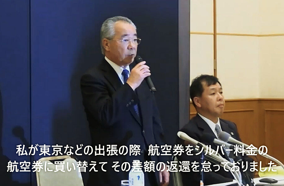 私が東京などの出張の際 、航空券をシルバー料金の航空券に買い替えて、その差額の返還を怠っておりました。現在、弁護士を通じて各所に資料を求めて、具体的な返還額を計算しておりますが、資料等がそろうまでに、今しばらく時間がかかりますので、資料がそろって正確な返還額が判明次第、各関係各位に差額の返還を行ってまいります。