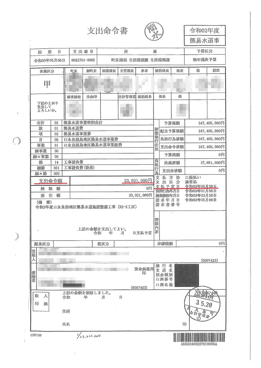 工事が終わっていないにもかかわらず、業者へ工事請負代金の前払いを決裁した支出命令書。荒木耕治町長、日高豊副町長、総務課長ら町幹部が押印している