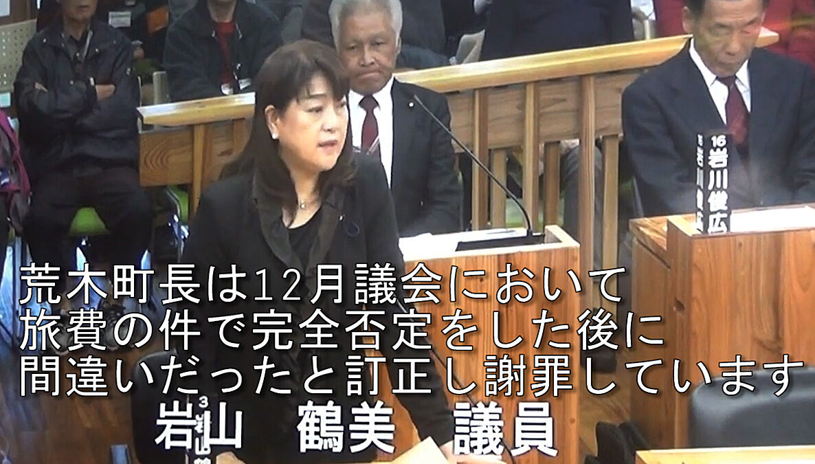 「荒木町長は12月議会において旅費の件で完全否定をした後に、間違いであったと訂正し謝罪をされています」