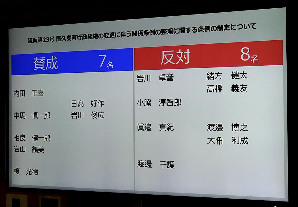 屋久島町役場の組織を変更する条例案の採決結果を表示するモニター画面(2022323日、屋久島町議会、議会中継のモニター画面を撮影)