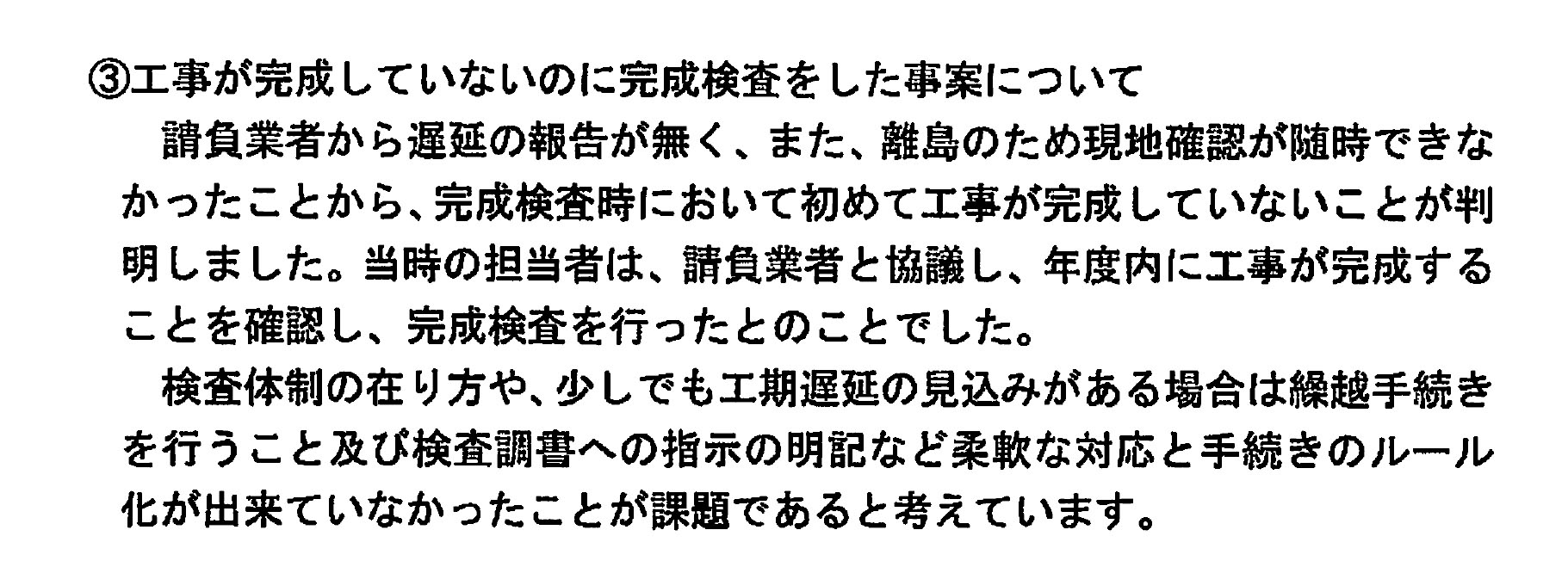報告書によると、町は「請負業者から遅延の報告が無く、また、離島のため現地確認が随時できなかったことから、完成検査時において初めて工事が完成していないことが判明しました」と説明している。さらに「請負業者と協議し、年度内に工事が完成することを確認し、完成検査を行った」としている。