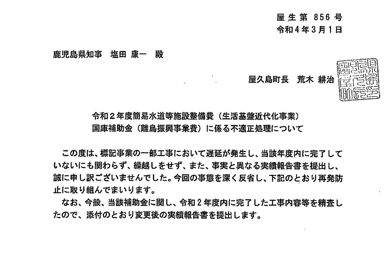 屋久島町が2022年3月1日付で鹿児島県を通じて国に提出した報告書の冒頭部分。「事実と異なる実績報告書を提出し、誠に申し訳ございませんでした」などと書かれている