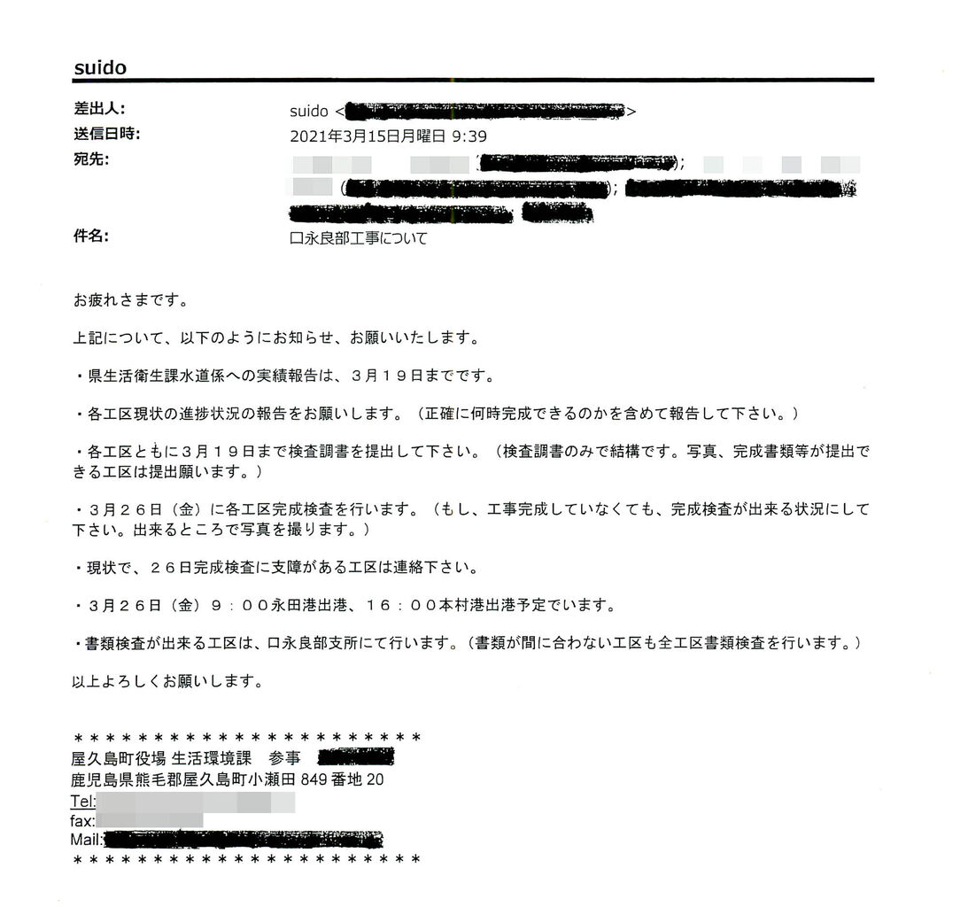 業者によると(*1)、2021年3月15日付で、同課から「口永良部工事について」と題するメールが複数の業者に送られた。文面には「各工区現状の進捗状況の報告をお願いします」「現状で、26日完成検査に支障がある工区は連絡下さい」などとあったため、業者は同課の担当職員の一人に電話を入れ、工事が未完成であることを報告したという。