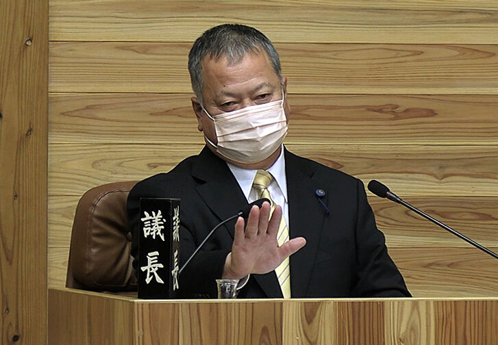 議員席から取材拒否の理由を問われた後、手を出して発言を制止する石田尾茂樹議長。この後、屋久島ポストのカメラは議場から排除された(2021年12月7日、屋久島町役場議会棟)