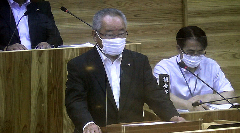 補助金不正請求の再発防止策などについて、一般質問で答弁する荒木耕治町長(2022615日、屋久島町議会、町役場内の議会中継モニター画面を撮影)