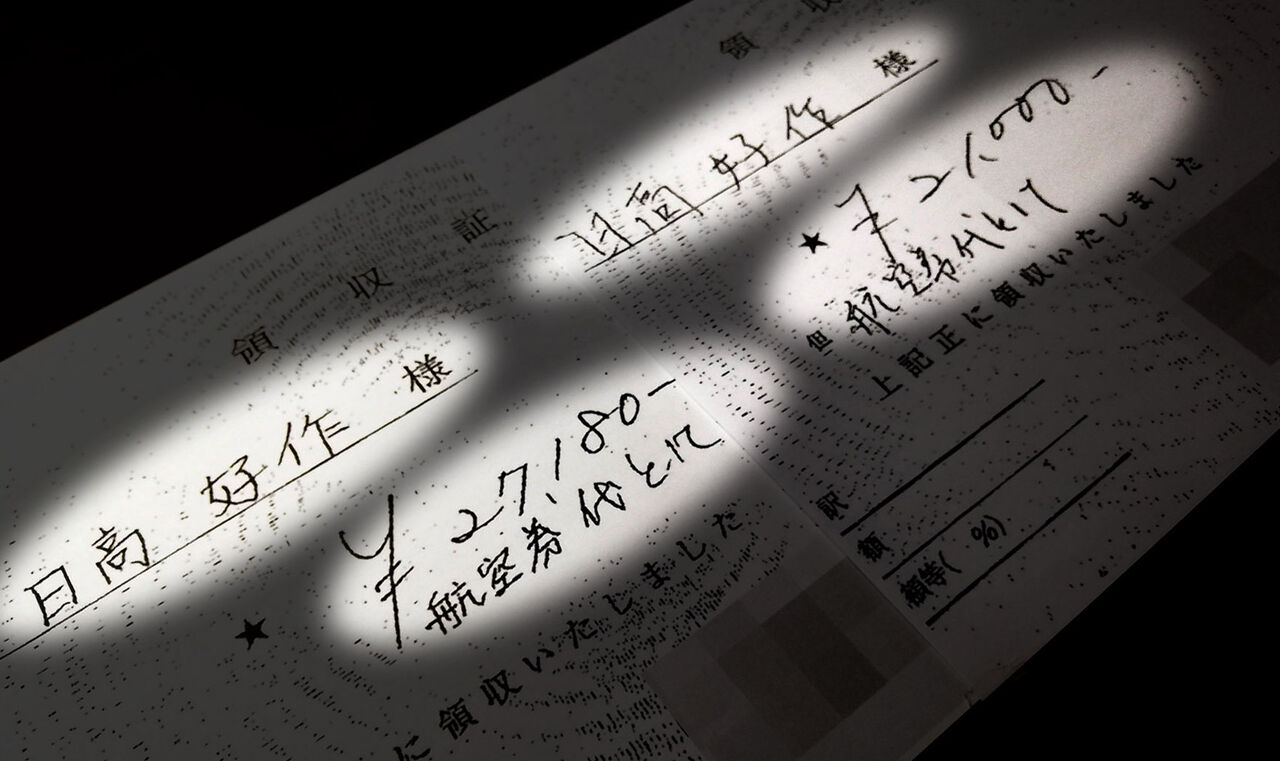 日高好作町議が旅費精算書に添付した2枚の領収書。航空券代として、計4万8180円の金額が記載されているが、領収書を発行した旅行会社には販売記録が残されていなかった