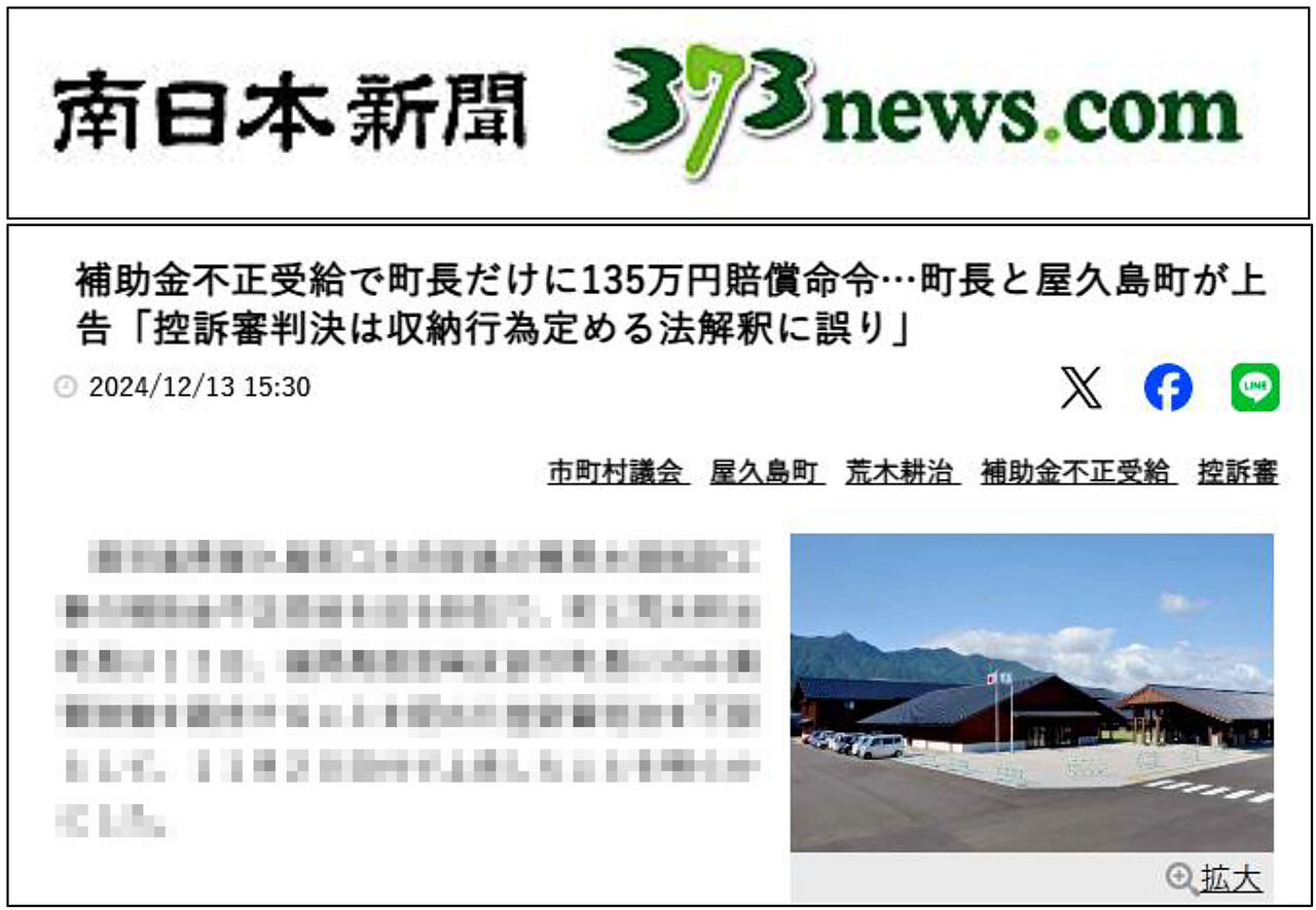 国に返還した約1668万円を屋久島町長らに賠償請求