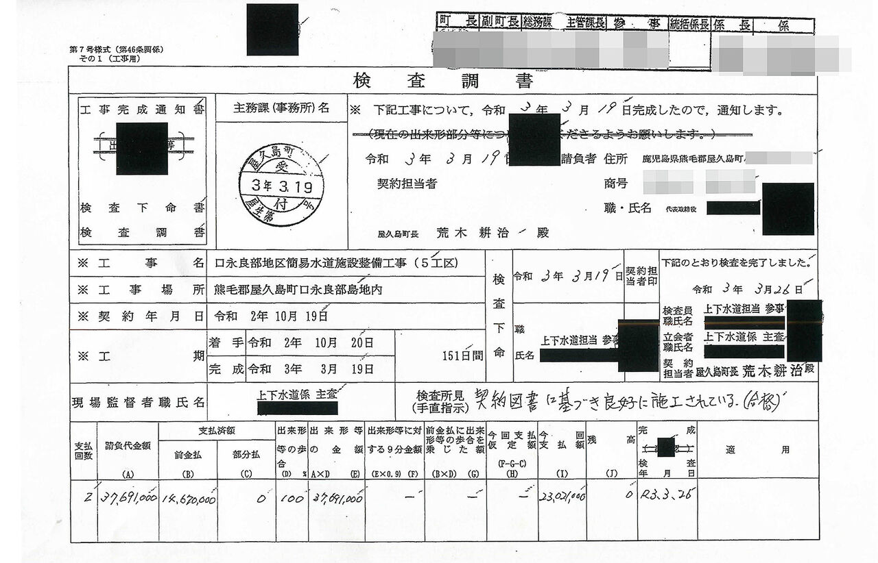 屋久島町が国に提出した虚偽の検査調書。全工事の約15%しか工事が終わっていないにもかかわらず、「契約図書に基づき良好に施工されている(合格)」と記載した