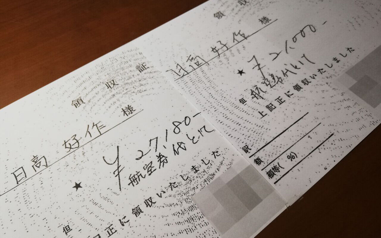 日高好作町議が出張旅費の精算書に添付した架空の領収書。航空券代として計4万8180円と記載されているが、この領収書を発行した旅行会社には、日高町議が航空券を購入した記録は残されていなかった