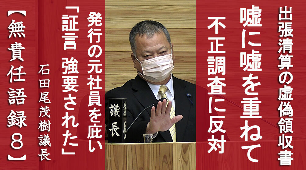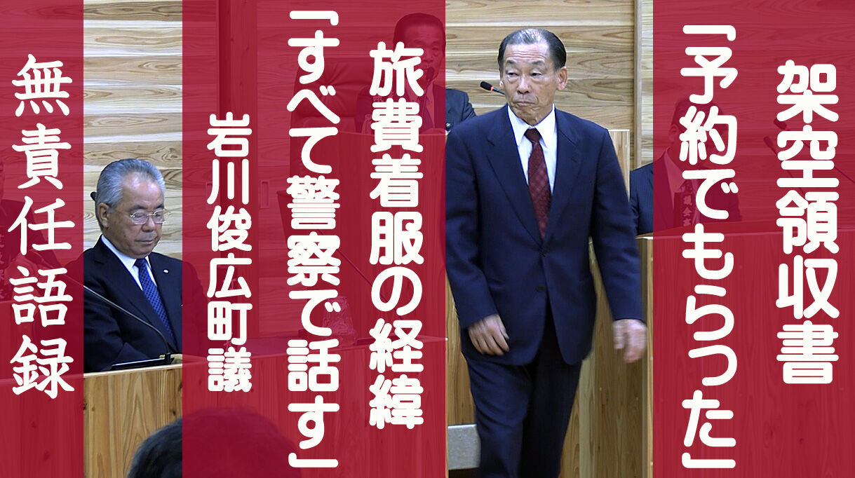 すでに記事を配信したなかでは、荒木耕治町長の虚偽答弁を信じて、町長の出張旅費着服を証言した町民に「名乗り出られるのか」と迫った岩山鶴美町議。架空の領収書で出張旅費の不正精算をしておきながら、「記憶にございません」「予約した時に(領収書を)受け取った」などと釈明したうえで、不正調査の百条委員会に自ら反対した日高好作、岩川俊広の両町議。