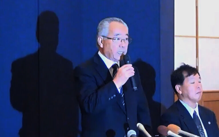 記者会見で出張旅費の不正精算について謝罪する荒木耕治町長。旅費の着服額は約200万円だった(2020年4月2日、屋久島町宮之浦)