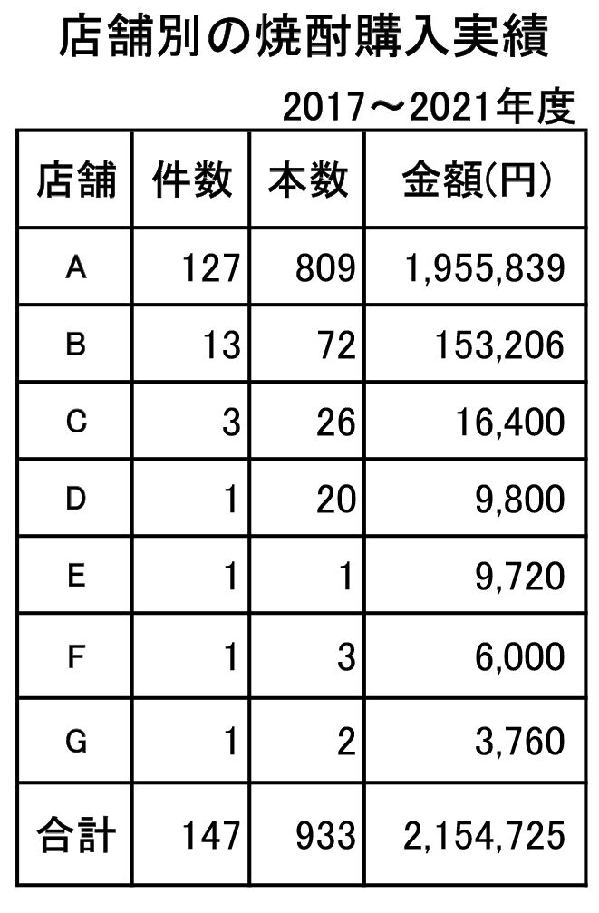 屋久島ポストが開示請求した交際費の支出記録によると、20172021年度の5年間で、荒木町長が焼酎を贈答したのは147件、933本で、総額は2154725円だった。そのうち、町内にあるA店からは127件、809本を贈り、購入額は1955839円。全体の約9割にあたる発注がA店に集中していた。そのほかでは、B店が13件、72本、153206円、C店が3件、26本、16400円などとなり、A店への発注が極端に多いことがわかる。