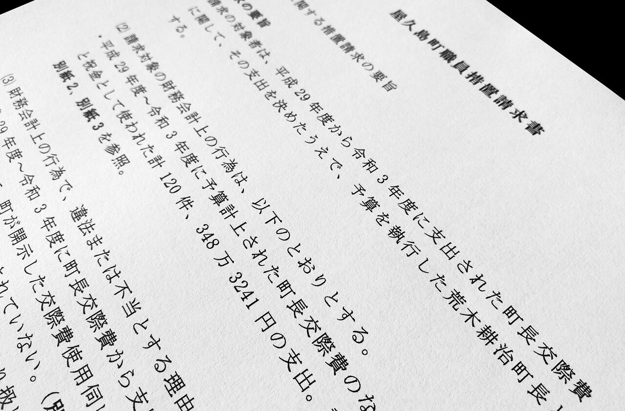 監査請求書によると、2017年度~2021年度の5年間に支出された交際費のうち、贈答に使われた計120件、348万3241円分の全額について、町に返還することを荒木町長に要求。計120件のうち、118件、344万1935円の支出については、町が開示した支出記録に贈答の詳細な理由や目的が記載されておらず、一般経費の支出について、「債権者のためでなければ、これをすることができない」と定めた地方自治法(232条の5)に違反するとしている。