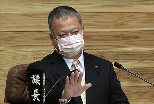 「屋久島ポスト」を議場から排除する理由を質問する町議に対して、発言を制止する屋久島町議会の石田尾茂樹議長(2021年12月7日、屋久島町議会)