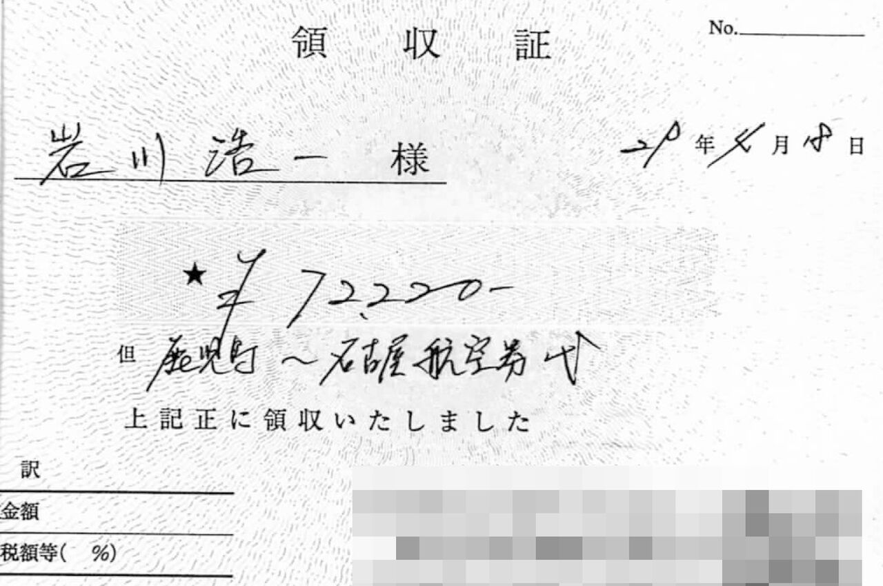 岩川浩一副町長(当時)が不正精算で使ったニセの領収書。実費より高額の料金が記載され、但し書きの経路も虚偽の内容だった