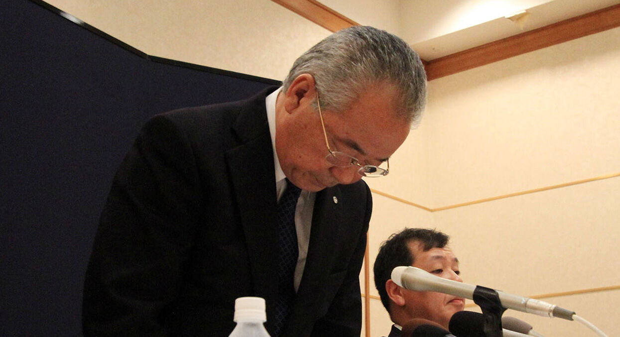出張旅費不正問題について記者会見で謝罪する荒木耕治町長(2019年12月26日、屋久島町内のホテル)