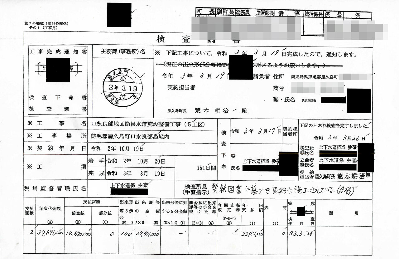 屋久島町が国に提出した虚偽の検査調書。工事が未完成でありながら、「契約図書に基づき良好に施工されている(合格)」などと記載されている