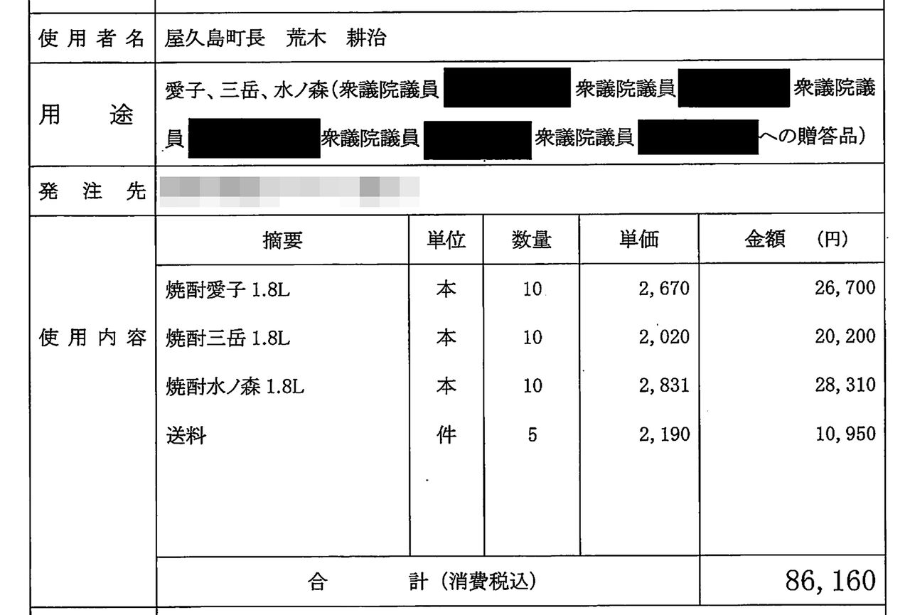 荒木耕治町長が焼酎「三岳原酒」24本をまとめて贈答した際に起票した「交際費使用伺い」の文書。黒塗りされた贈り先は森山裕衆院議員で、森山事務所は「町長個人から贈答」との認識で、「名産品のPR用」として配ったとしている