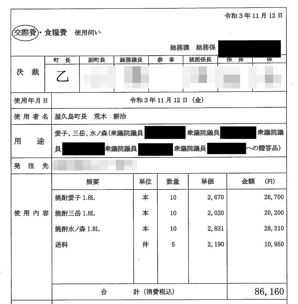 だが、そもそも公平であるはずの立法において、贈答で親しくなった国会議員の手助けで、屋久島町だけが有利な扱いを受けていいのだろうか。それも、多い時は1回で計10万円もする高級焼酎36本を贈答して。