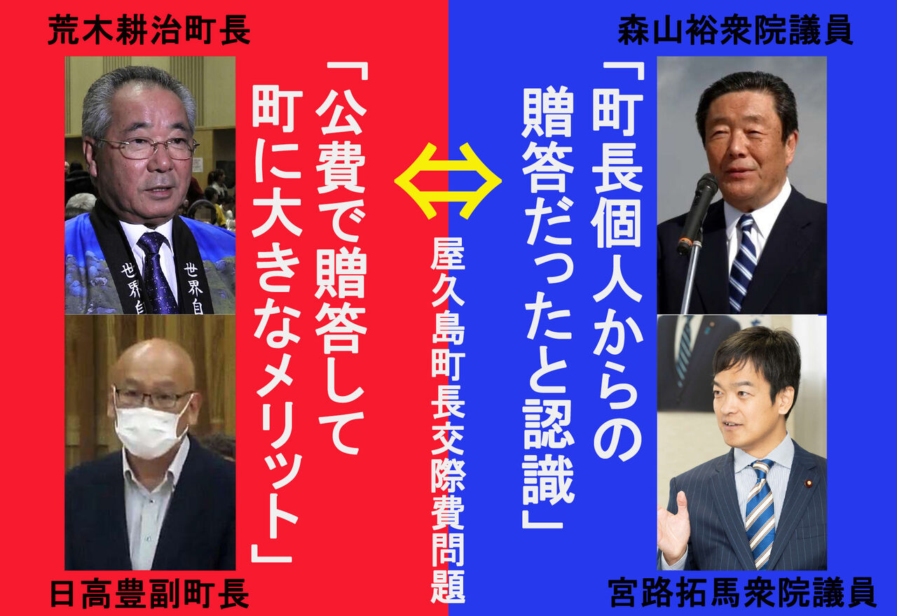 荒木町長が贈答した経費の出所をめぐり、国会議員側と屋久島町側で認識が大きく食い違っている格好である。
