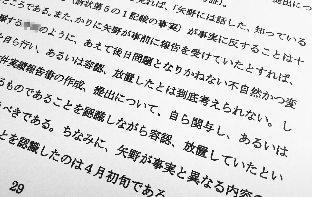 したがって、矢野が本件実績報告書の作成、提出について、自ら関与し、あるいはその内容が事実に反するものであることを認識しながら容認、放置していたということはありえないというべきである。ちなみに、矢野が事実と異なる内容の実績報告書が提出されていたことを認識したのは4月初旬である。