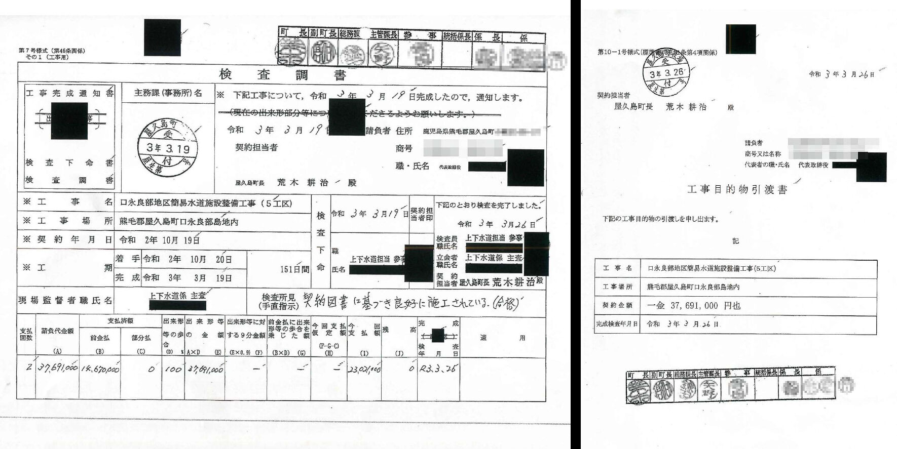 工事が終わっていないにもかかわらず、工事が完成したと虚偽の内容が記載された「工事目的物引渡書」(上)と「検査調書」(下)には、荒木耕治町長ら屋久島町幹部の決裁印が押されている