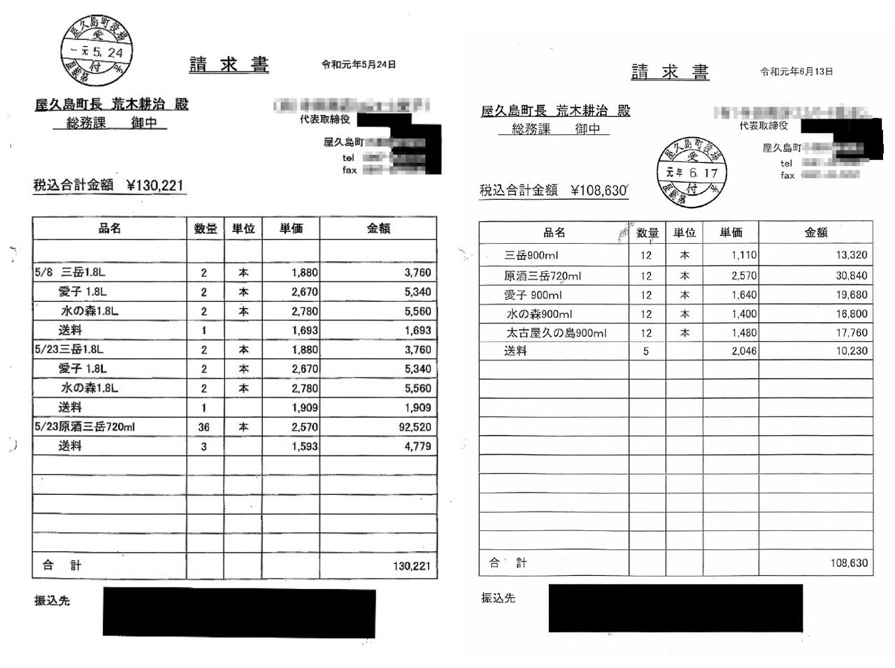 2019年5月と6月に屋久島町に出された請求書。2回の請求で焼酎110本分、約24万円が請求された