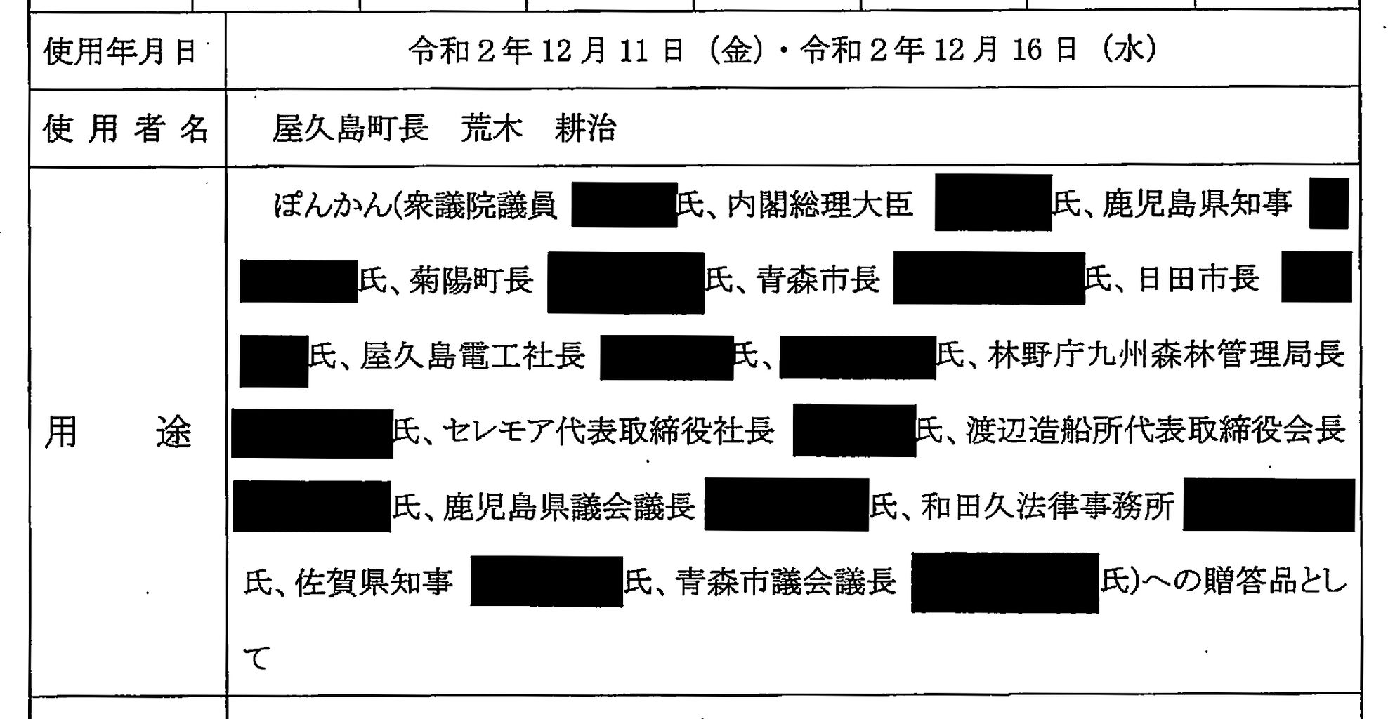 2020年12月に荒木耕治町長がポンカンを贈答した際に作成された交際費使用伺いの文書。国会議員や鹿児島県知事ら15件の贈答先が記載されている