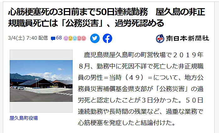 2023.03.04 屋久島町営牧場 過重労働死 南日本新聞が報道 屋久島町営牧場 過重労働死問題 yakushima-post 心筋梗塞死の3日前まで50日連続勤務 屋久島の非正規職員死亡は「公務災害」、過労死認める南日本新聞の記事を配信したヤフーニュースのページ画面 2019年8月に屋久島町営牧場で男性職員(当時49)が過重労働で死亡した問題で、南日本新聞は3月4日、職員の死亡が公務災害に認定されたことを報じた。 ■ヤフーニュース/南日本新聞 記事 ■南日本新聞 記事 ■屋久島町営牧場 過重労働死問題 記事一覧