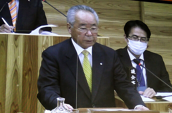 屋久島町議会3月定例会で演説する荒木耕治町長(2023年3月7日、屋久島町議会、議会中継モニター画面を撮影)