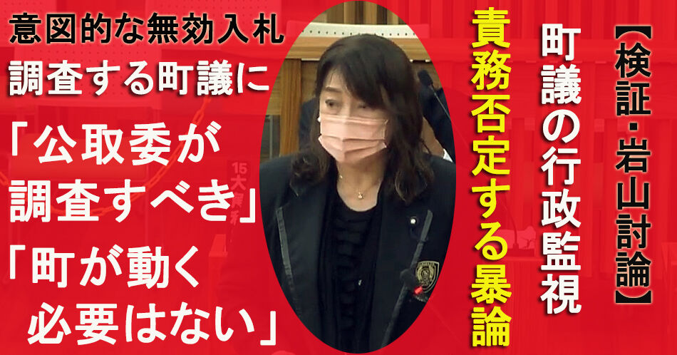 質問状ではまず、2社のみが参加した入札で川崎技研が意図的に無効な入札をした結果、価格競争がないまま落札業者が決まり、町民から「いったい何の目的で(川崎技研は)入札したのか?」という疑問の声が寄せられていると説明。それを受け、公正取引委員会に見解を求めたところ、「競争が働いたとは言い切れない」「なぜ予定価格を超える入札をしたのか、業者に事情を聴く必要がある」と言われたとして、「公取委から指摘された疑義を払拭できないままでは予算案を採決できない」と訴えた。