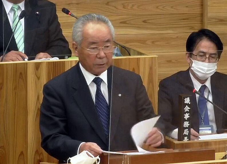 国への虚偽報告について答弁する荒木耕治町長=中央(2023年3月8日、屋久島町議会、同町議会YouTubeチャンネルより)