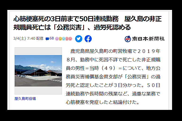 職員の公務災害をめぐっては、同基金の鹿児島県支部は当初、町が提出した勤務記録の労働時間が短いことを理由に公務災害には当たらないと判断した。それに対し、遺族は勤務記録の労働時間が「週40時間以下になるように改ざんを求められていた」と訴え、実際の労働時間を記録した文書を提出。その結果、同支部は「時間外勤務を含めた業務配分を現場の職員に任せ、そもそも業務命令権者として主体的に勤務時間を管理する体制になっていなかった」などと判断し、今年2月14日に過重労働で心筋梗塞を発症したことによる公務災害と認定した。