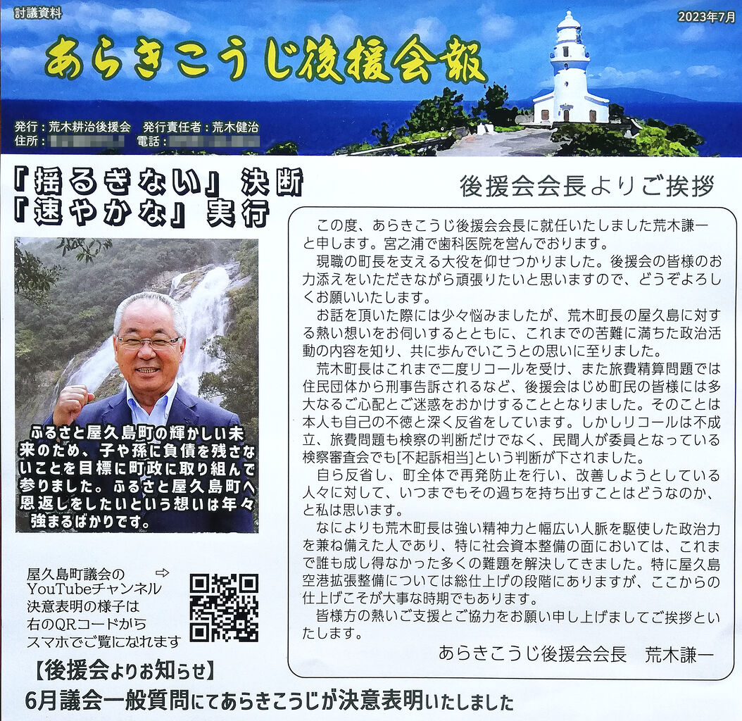 【取材後記】選挙運動チラシのような荒木後援会の「討議資料」 屋久島町長選2023