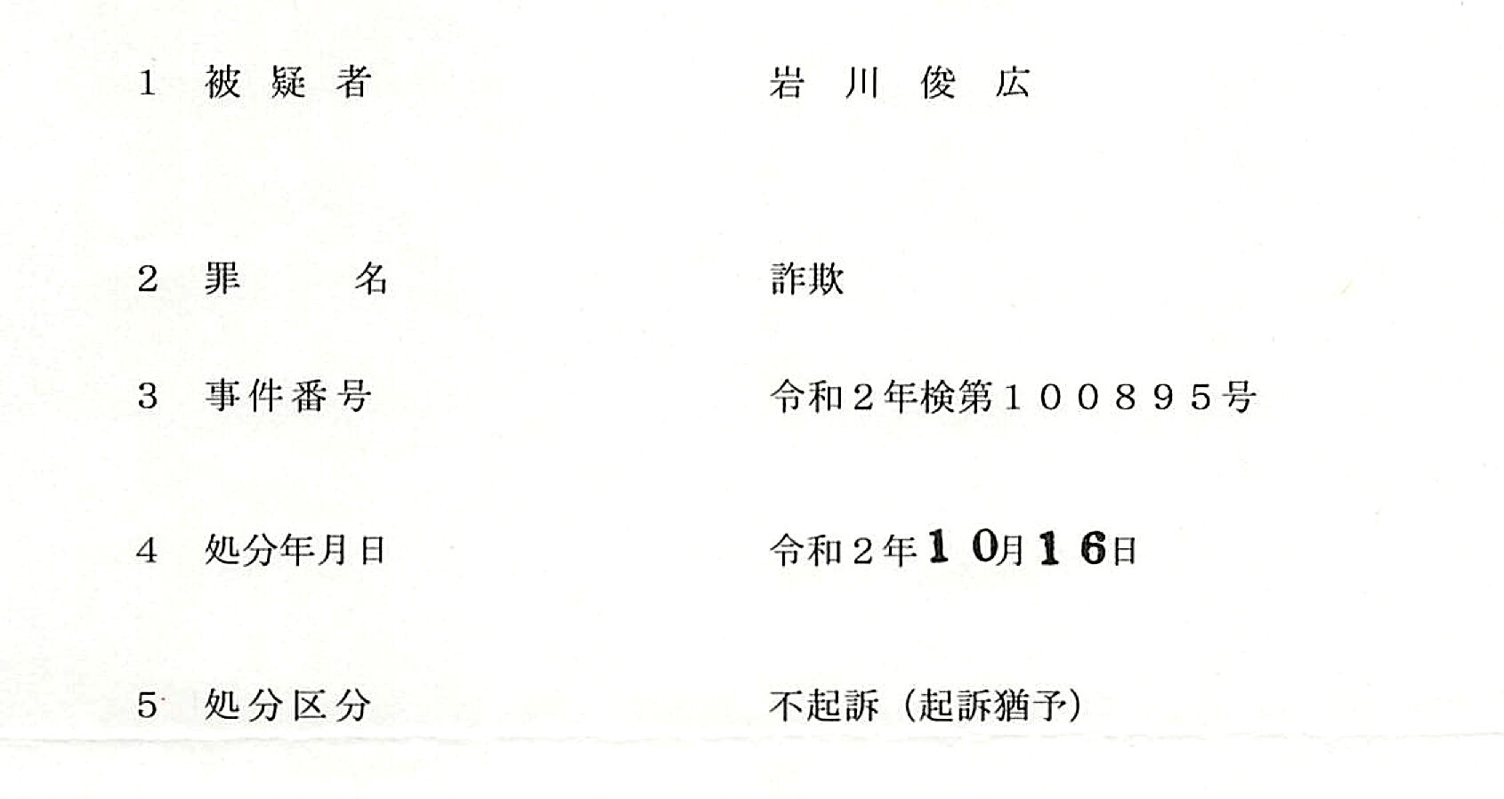 鹿児島地検が発行した岩川俊広町議に対する処分通知書の一部。不起訴の理由として「起訴猶予」と記載されている