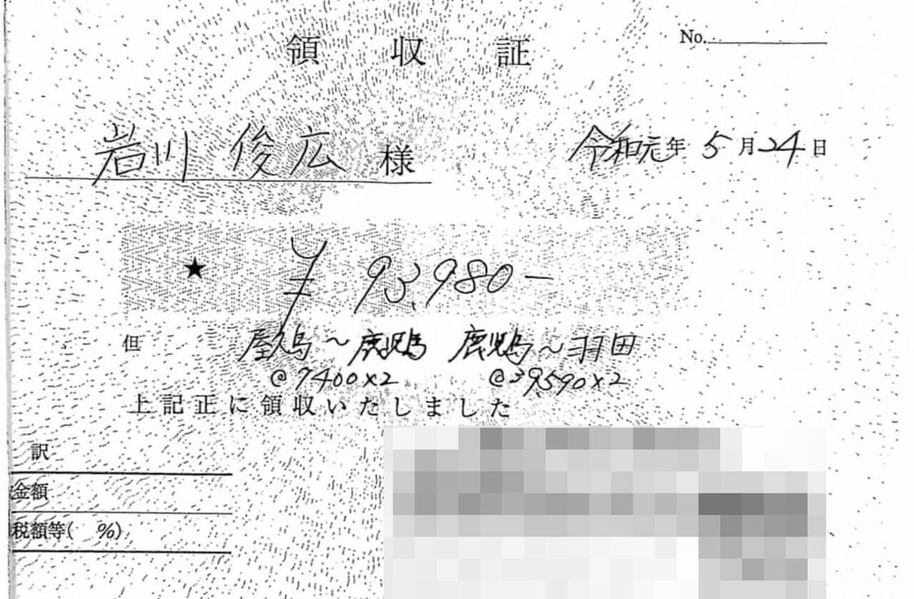 岩川俊広町議が出張精算で提出した航空運賃の虚偽領収書。実際には半額ほどの運賃で搭乗していた