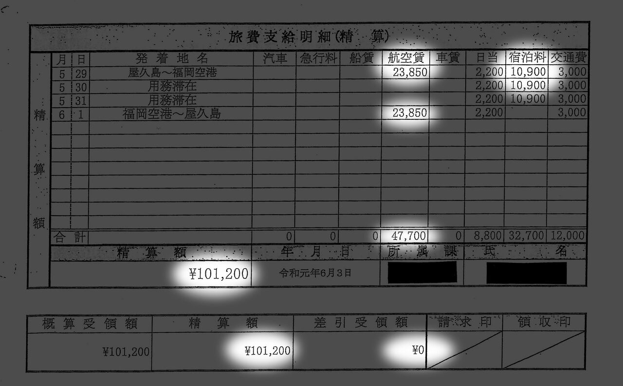 一例を紹介すると、一般職員Aは2019年5~6月に福岡市に出張した際に、屋久島空港と福岡空港の往復航空券代として、4万7700円と記載された領収書で旅費精算した。それに加え、福岡市内のホテル代3泊分として3万2700円も受け取った。