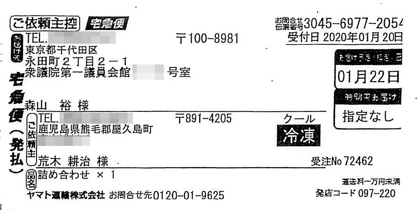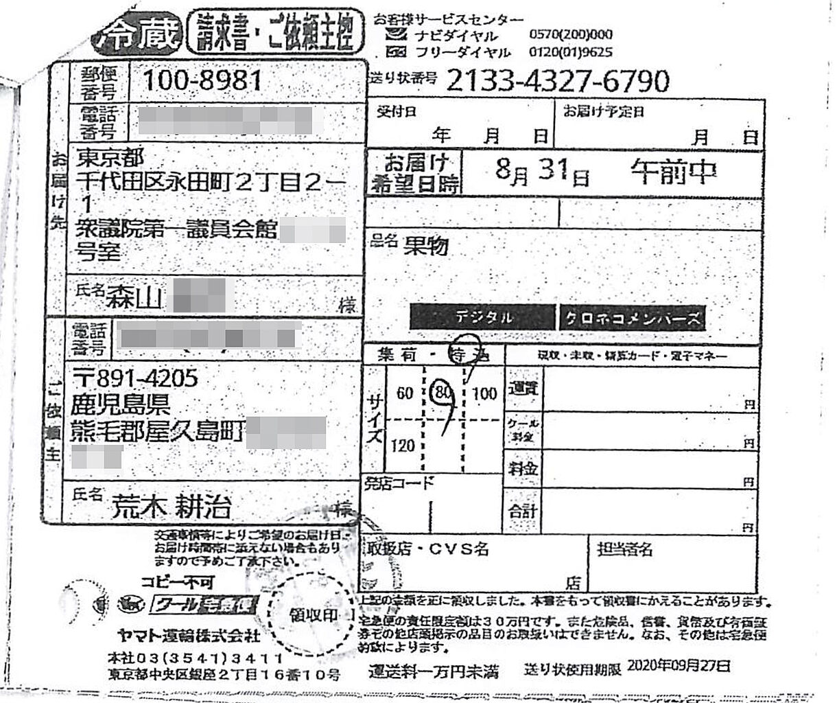 荒木耕治町長が自宅から森山事務所に個人的な贈答をした際に発行されたとする送り状。宛名の下の名前が森山裕衆院議員とは違っていた