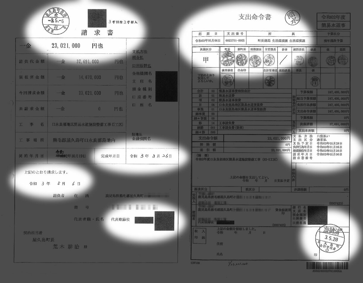 【上左】工事未完成で「工事完成」と報告した虚偽の検査調書【上右】屋久島町の荒木耕治町長【下】鹿児島地裁の法廷と外観(裁判所ウェブサイトより)