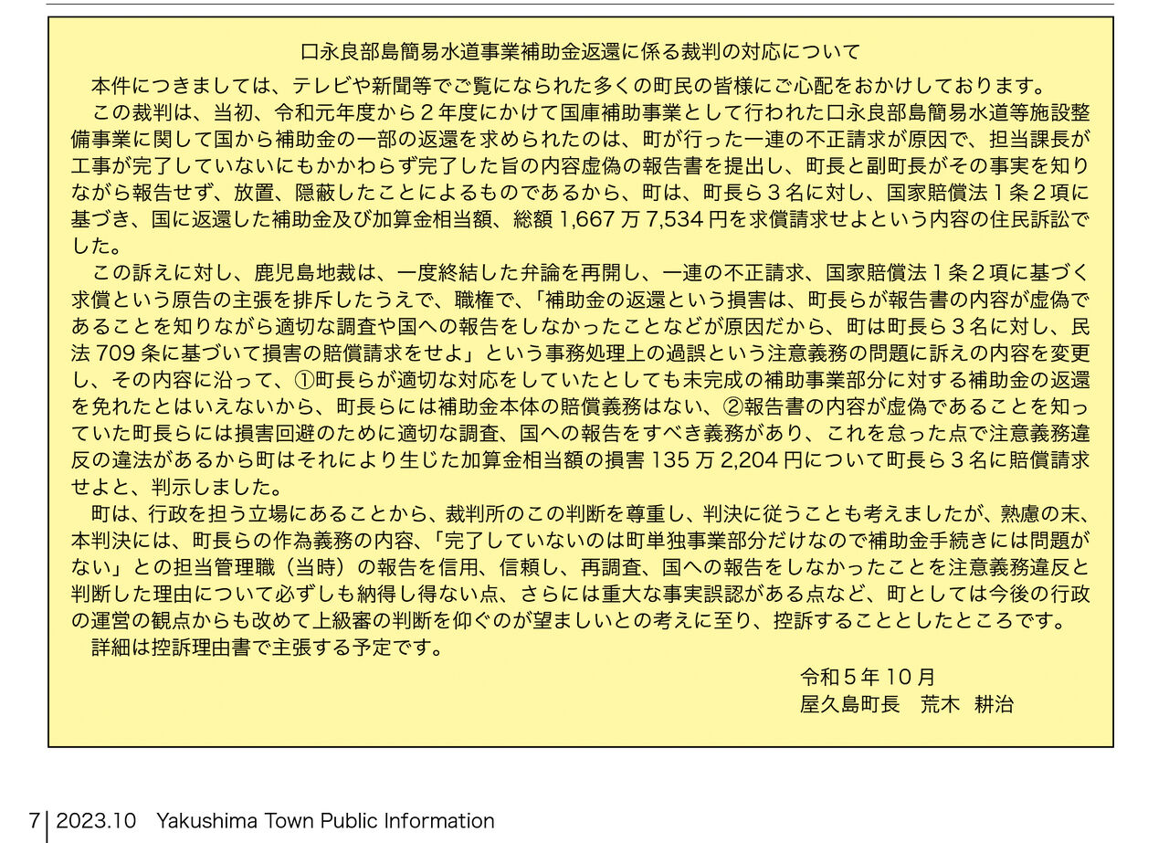 屋久島町が実施した水道工事の補助金不正請求をめぐる住民訴訟で、鹿児島地裁は9月6日、国から補助金の返還命令を受けた責任の一部が荒木耕治町長ら町幹部にあるとして、被告の町に対し、荒木町長ら3人に約135万円を賠償請求するように命じる判決を言い渡した。一方で、町は一審判決に不服があるとして控訴を決定し、その理由を「町報やくしま」10月号で次のように伝えている。