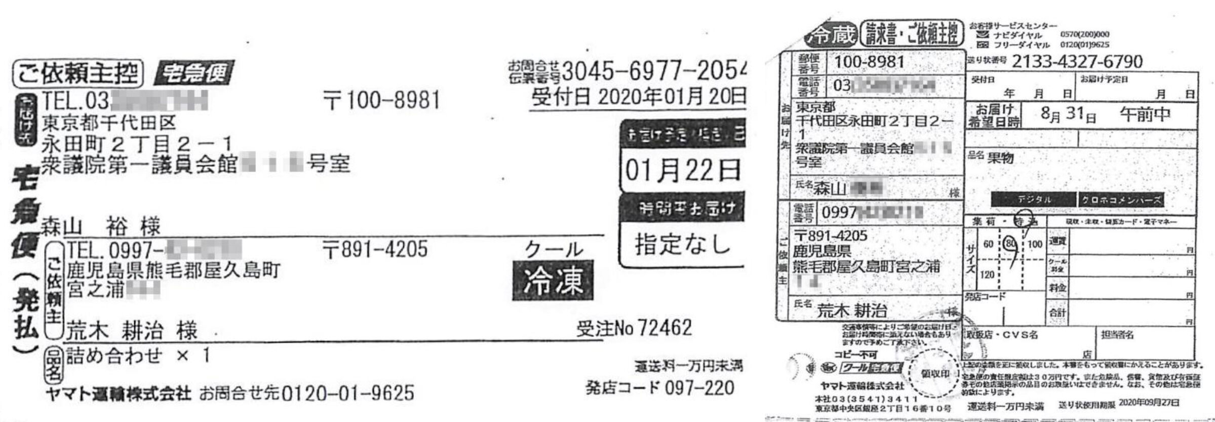 屋久島町の荒木耕治町長が森山裕衆院議員に私費で贈答した証拠として、町が裁判所に提出した2通の送り状(※個人情報保護のため一部でモザイク加工をしています)