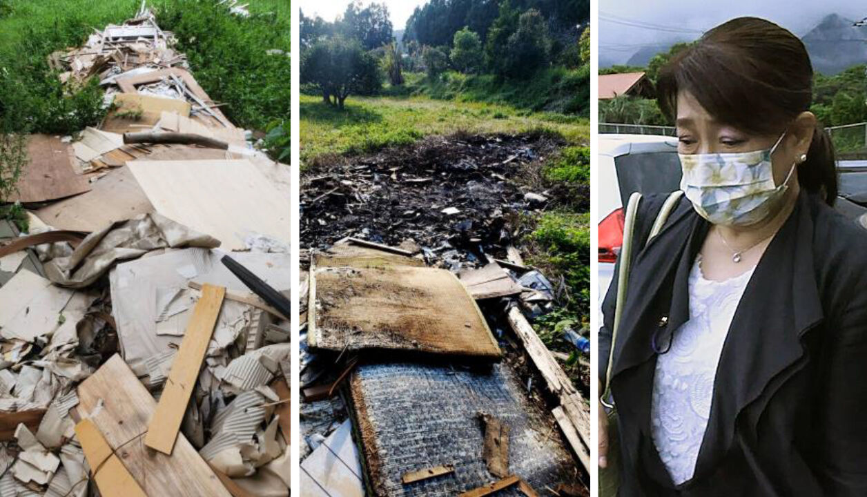 【左】投棄されたアパートのリフォーム廃材(2020年9月14日、町民撮影)【中央】不法に焼却された廃材や畳など(2021年1月5日、町民撮影)【右】議員辞職勧告決議案の可決後、無言で議会を後にする岩山鶴美町議(2023年9月5日、屋久島町役場)