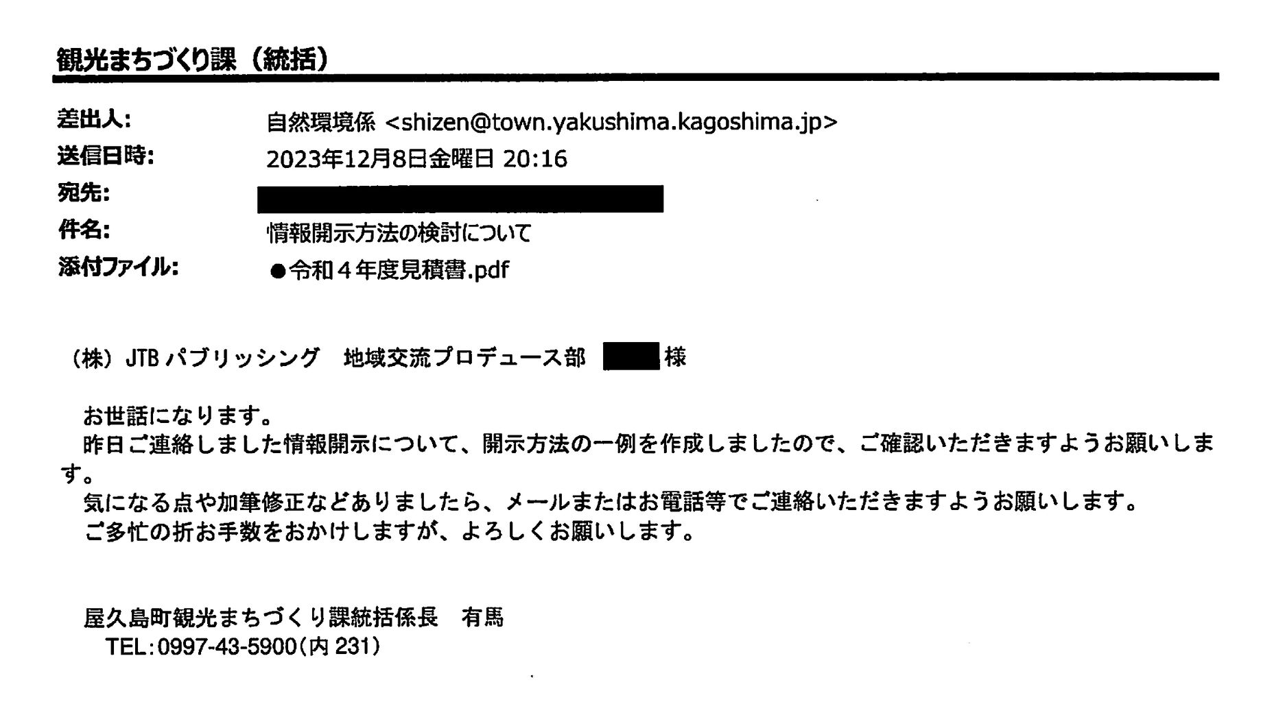 町観光まちづくり課が2023年12月8日にJTBパブリッシングに送信したメール。見積書の一部を黒塗りで非開示にする一例を提案する内容だった